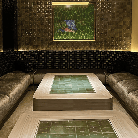 有田焼の優美な壺や、壁面の組子細工がオリエンタルな雰囲気を演出しています。